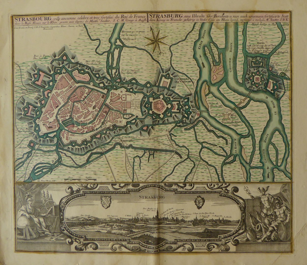 Kaart van Straatsburg "Strasbourg, eine Uhralte sehr Berühmste...", ingekleurd