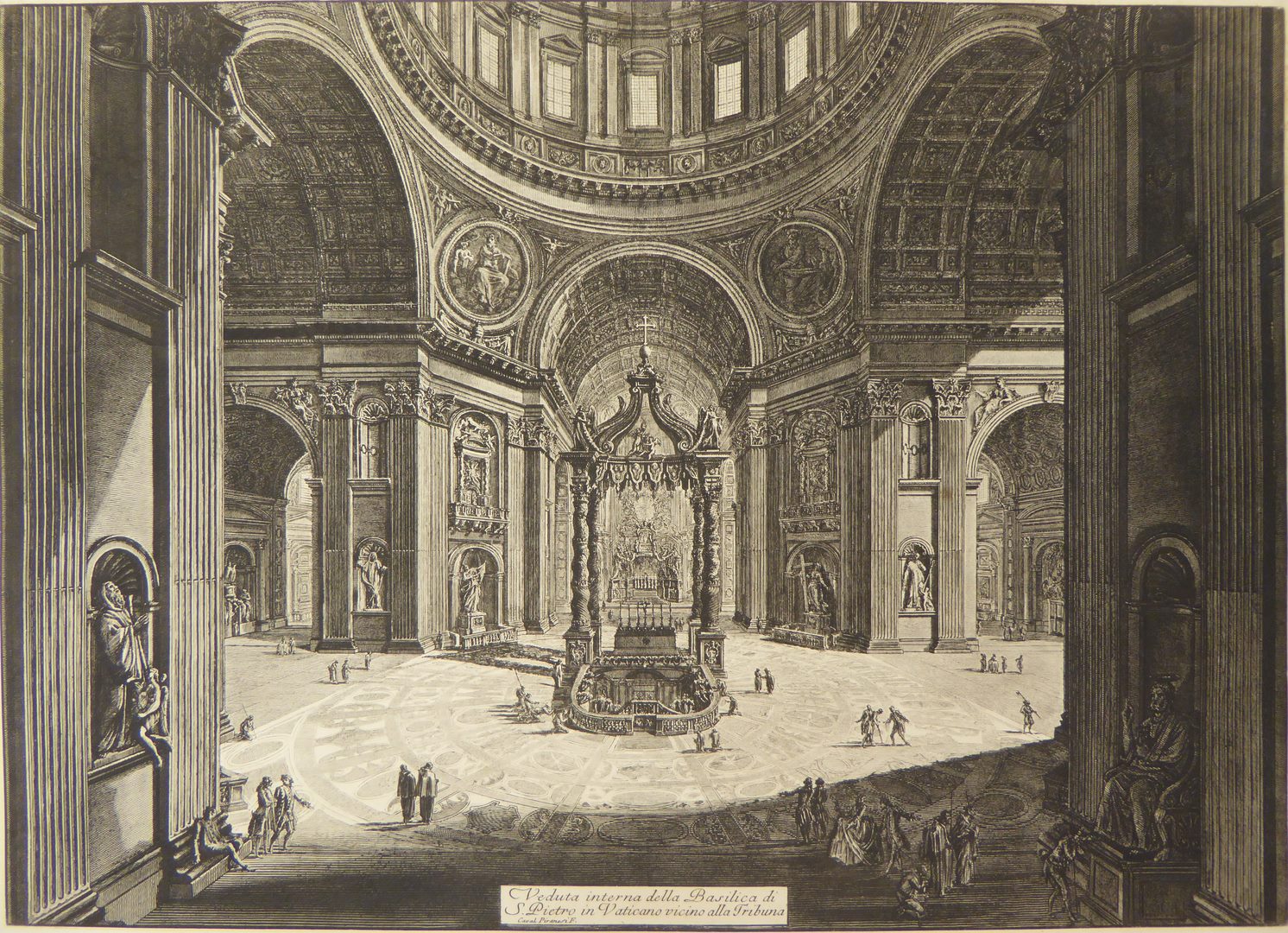 Rome, interieur (w.o. hoofdaltaar) van de St. Pieter, late afdruk van oude koperplaat