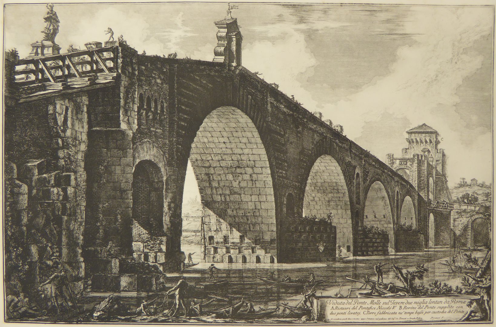 Rome, gezicht op de Ponte Molle over de Tiber, late afdruk van oude koperplaat