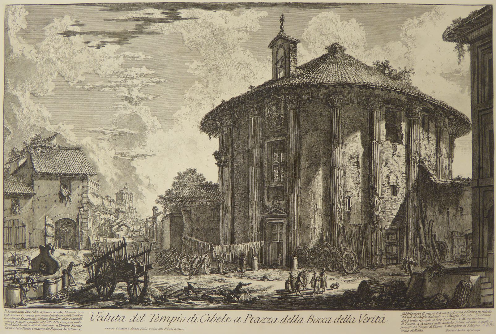 Rome, gezicht op Cibele tempel en het plein Bocca della Verita, late afdruk van oude koperplaat