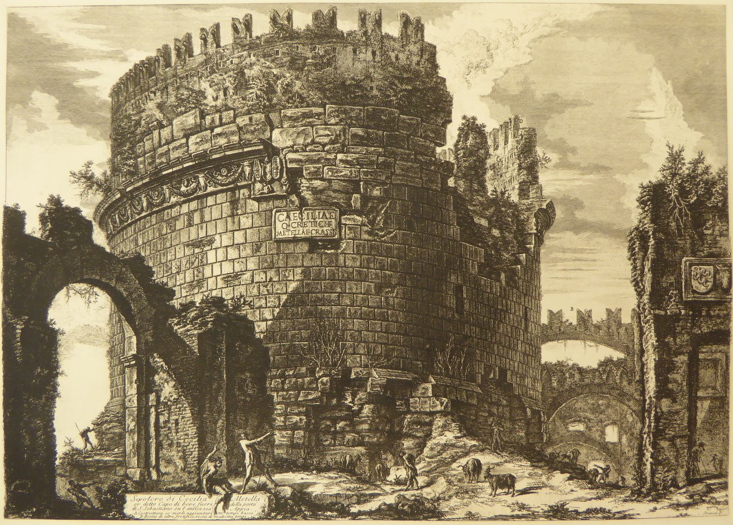 Rome, graf van Cecilia Metella aan de Via Appia, late afdruk van oude koperplaat