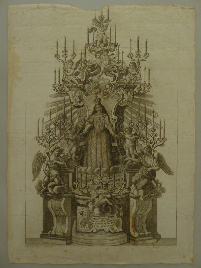 Maria van de berg Carmel met scapulieren op voetstuk met engelen en kandelaars