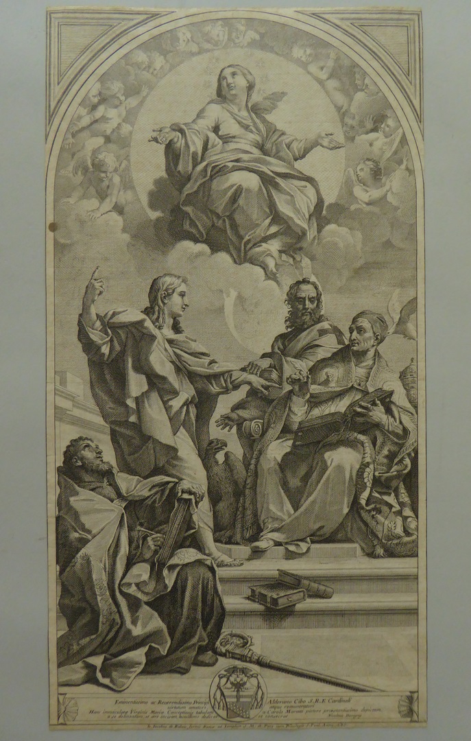 Maria Onbevlekt Ontvangen met evangelist Johannes en paus Gregorius, opdracht kardinaal Alderano Cibo