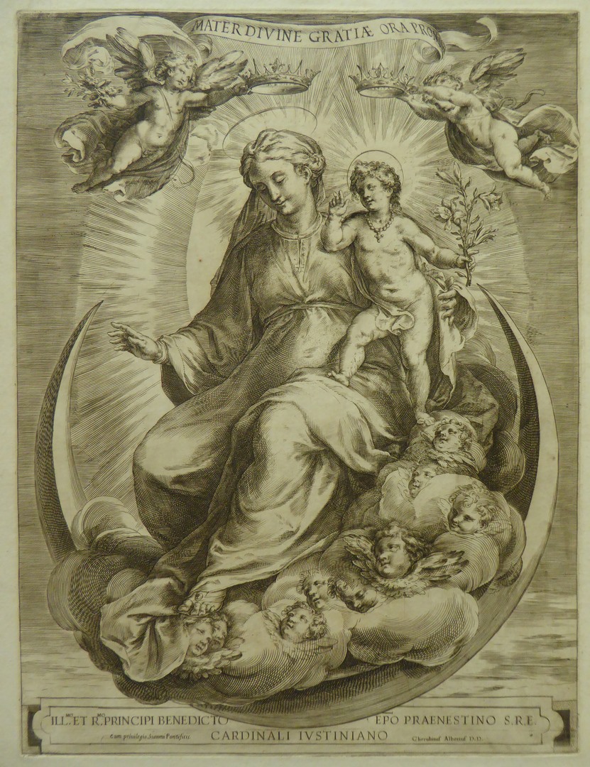 Maria met kind, Moeder van de Goddelijke Genade op maansikkel met cherubs in wolken