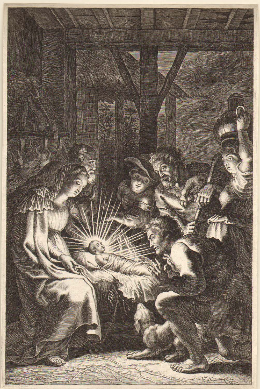 Aanbidding der herders: Prent met sterke lichtsymboliek. Aan de linkerkant van het midden het Christuskind dat in doeken gewikkeld ligt op kribbe die met hooi/stro is gevuld. Zijn hoofd ligt op een kussen (?) en heeft een ouwelijke uitdrukking. Vanuit zijn hoofd gaan zeer grote lichtstralen uit. Aan de linkerkant van Christus ligt Maria half ...