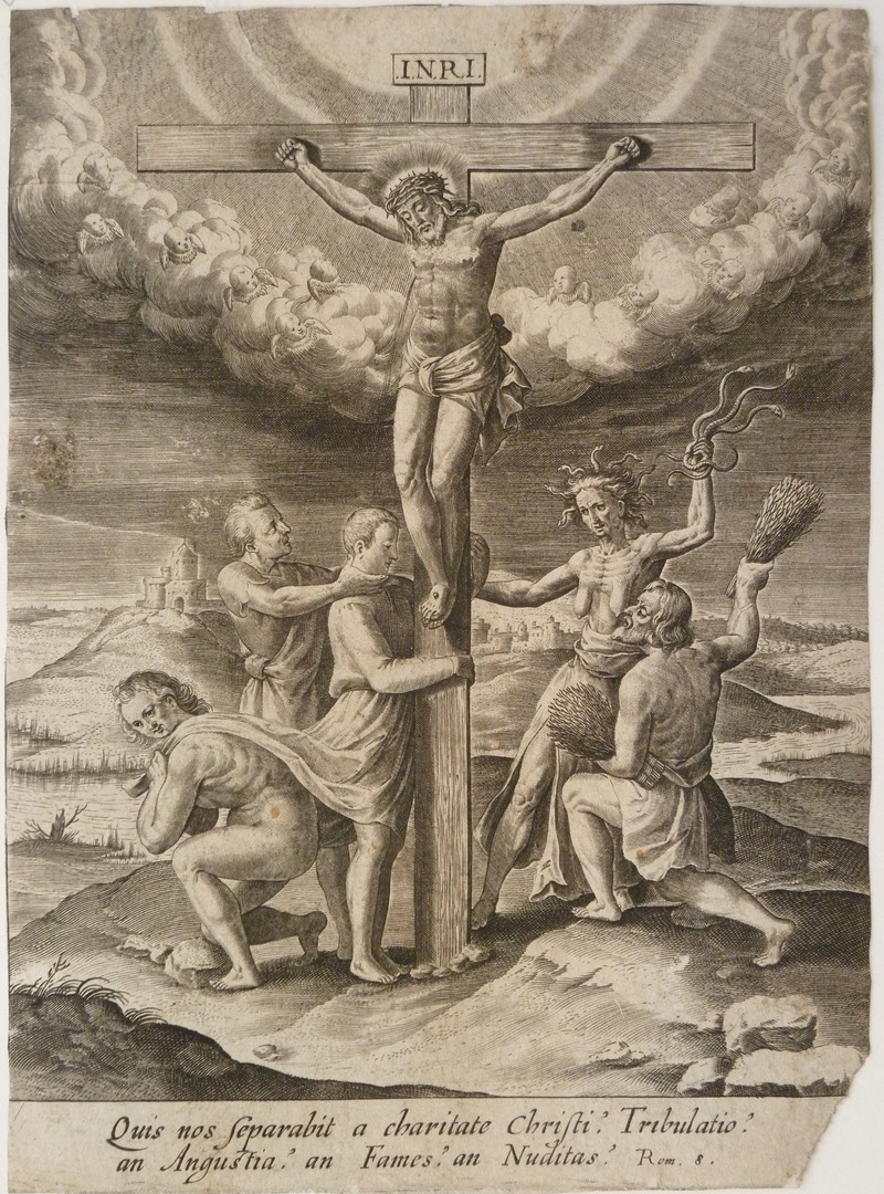 Christus aan het kruis, met daaronder personen (allegorie op de ondeugden)