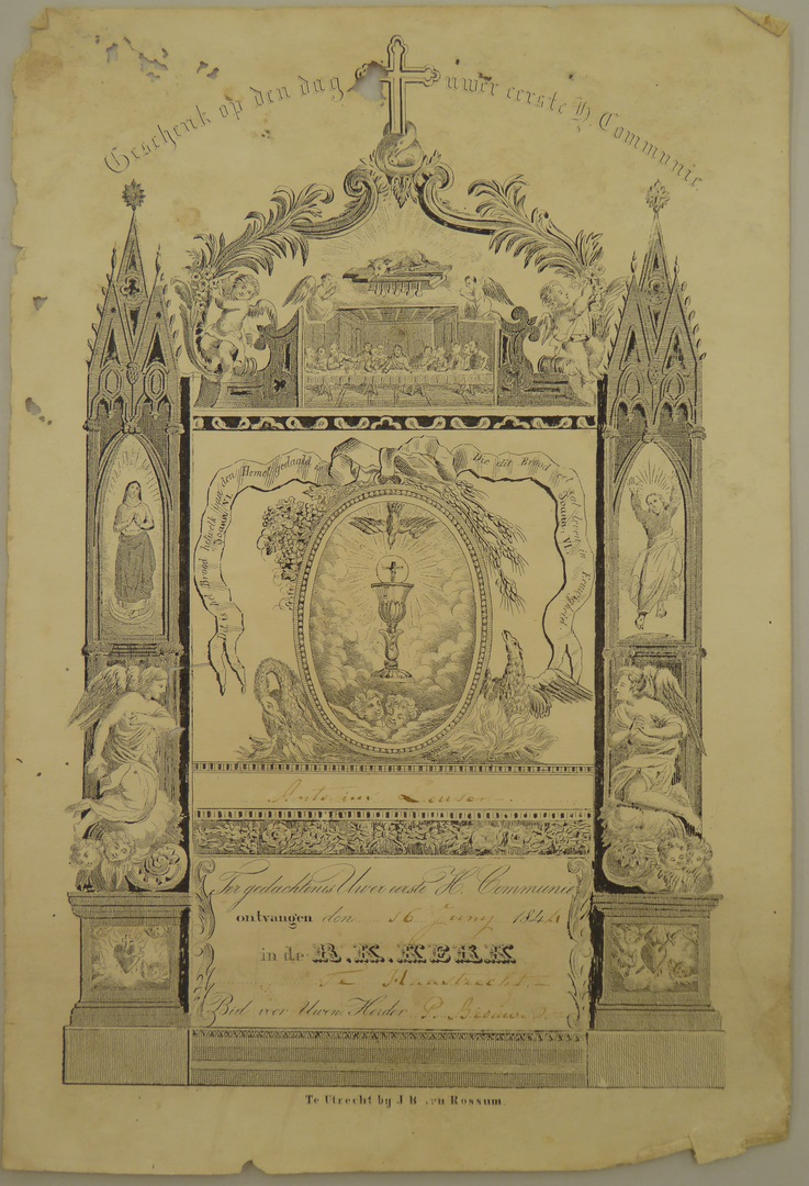 Communieprent van Antonius Leusen: kelk in neogotische omlijsting