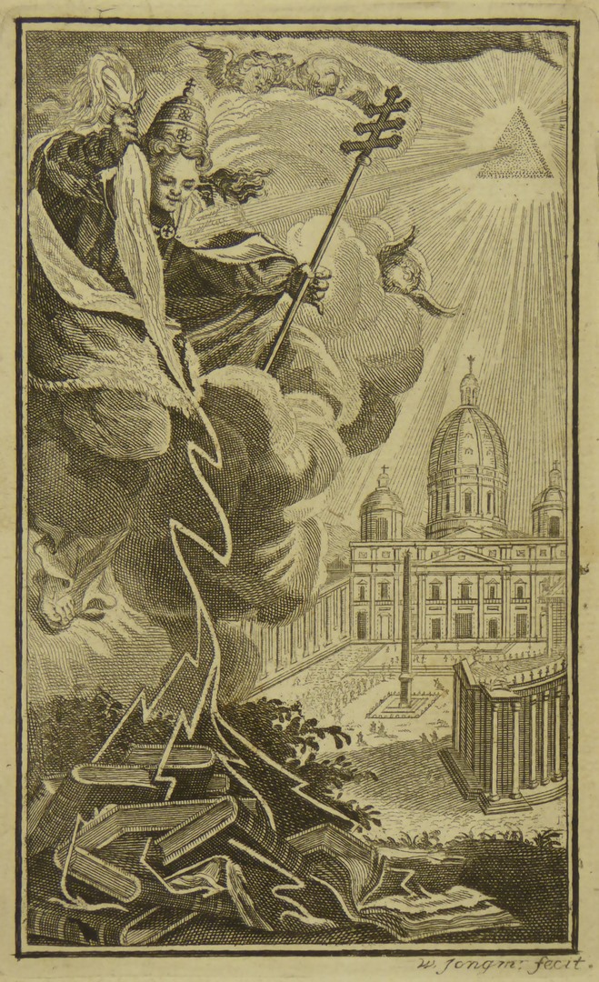Rome, St. Pieter en paus, die stapel boeken wil verbranden op wolk