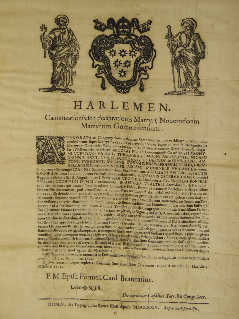 Goedkeuring van twee wonderen te Haarlem in het proces tot zaligverklaring van de Martelaren van Gorcum door F.M. Episc. Portuen card. Brancatius