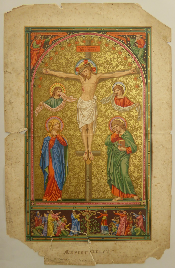 Chromoxylografie met gekruisigde Christus en Mozes en de bronzen slang (Num.21:9)