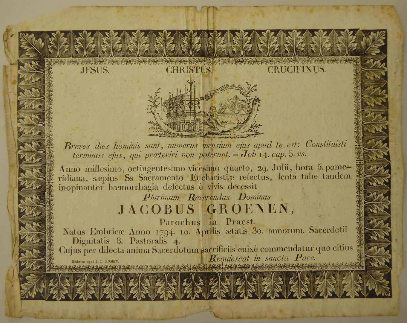 Overlijdensbericht van Jacobus Groenen, met afbeelding grafmonument met wenende putto