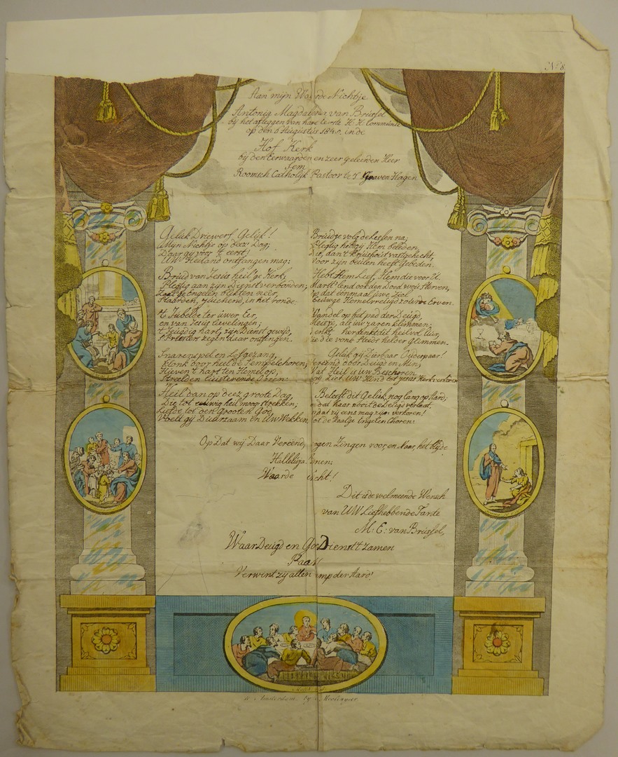 Communieprent van Antonia Magdalena van Brussel met handgeschreven gedicht van tante