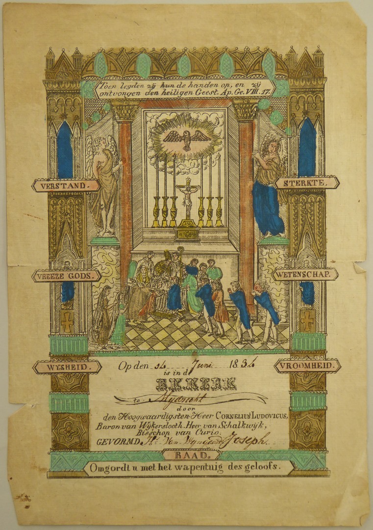 Vormselprent van H. van Wijngaarde (1832), Mijdrecht, door C.L. Baron van Wijckerslooth, bisschop, ingekleurd