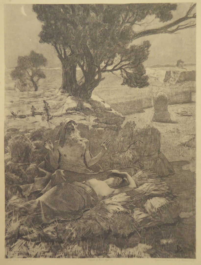 Bijbelplaat van zg. Julianabijbel: Ruth op de dorsvloer van Boaz (Ruth 3:4)