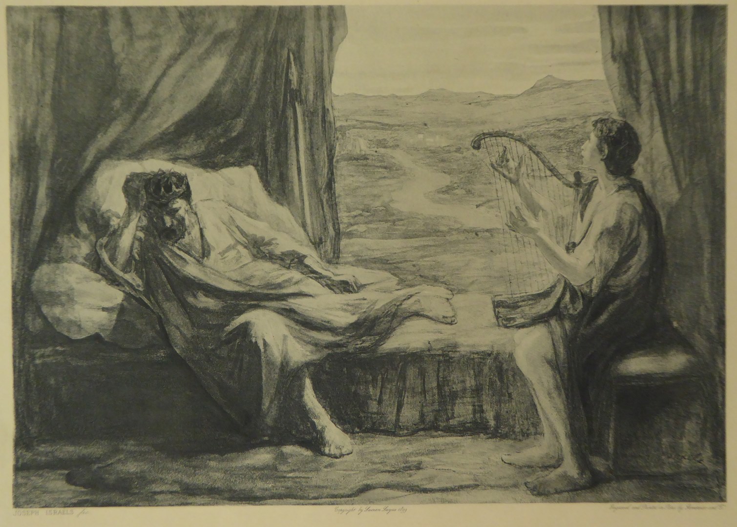 Bijbelplaat van zg. Julianabijbel: David verdrijft de boze geest bij Saul (1 Sam.16:23)