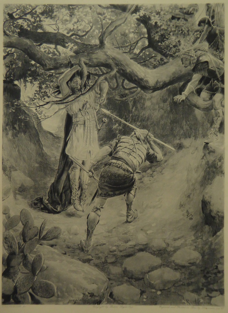 Bijbelplaat van zg. Julianabijbel: Absalom wordt gedood (2 Sam.18:14)