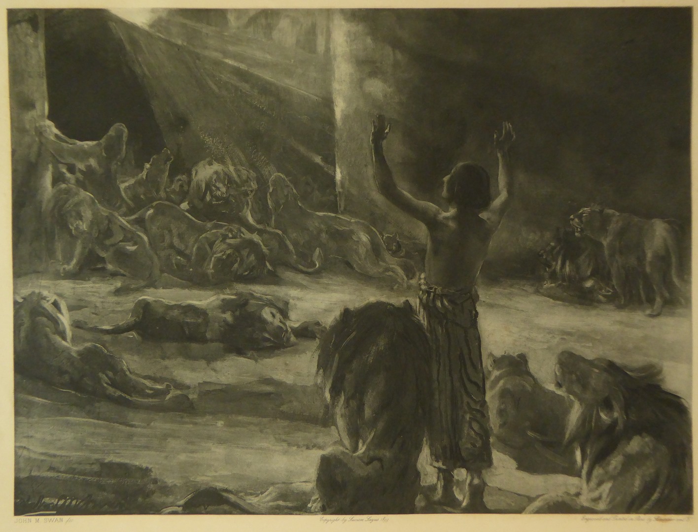 Bijbelplaat van zg. Julianabijbel: Daniël in de leeuwenkuil (Dan.6:21)