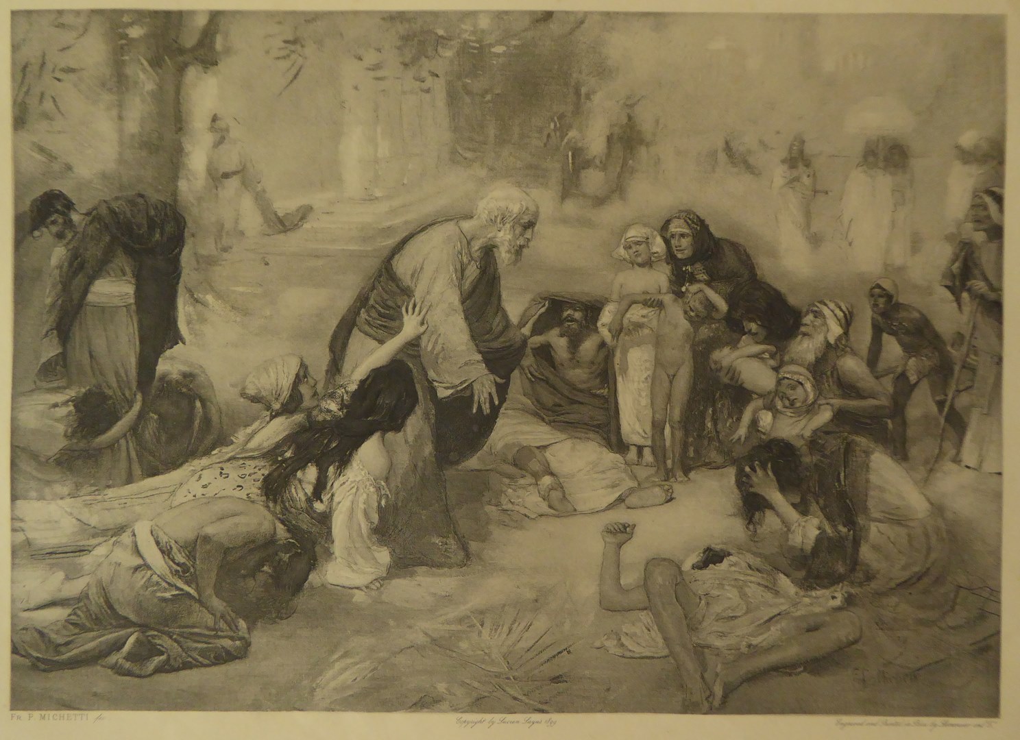 Bijbelplaat van zg. Julianabijbel: Mensen brengen zieken de straat op (Hand.5:15)
