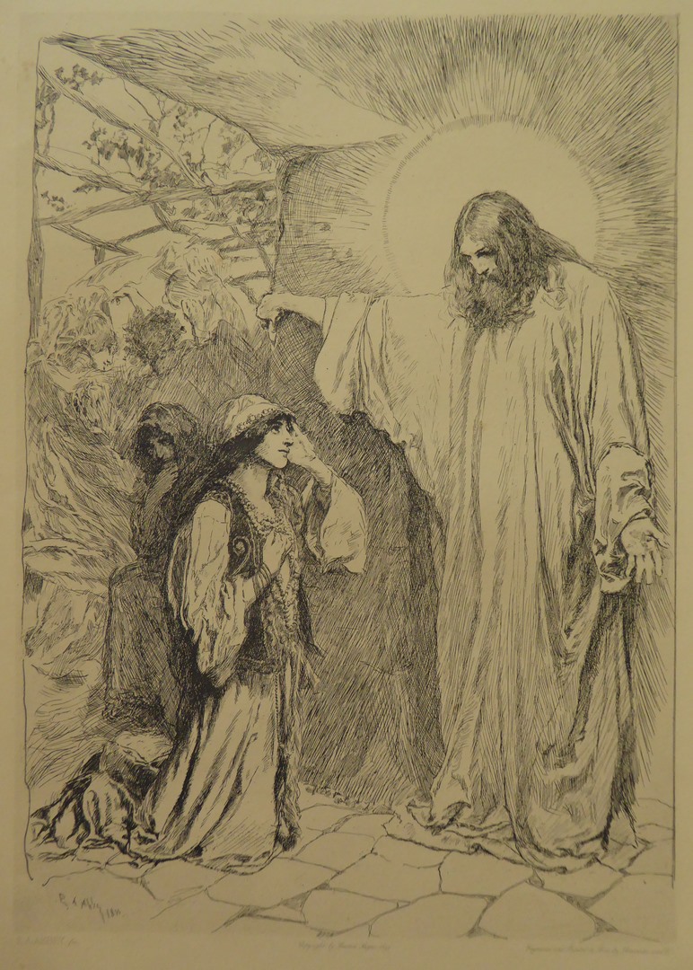 Bijbelplaat van zg. Julianabijbel: De Heer staat voor de deur en klopt (Op.3:20)