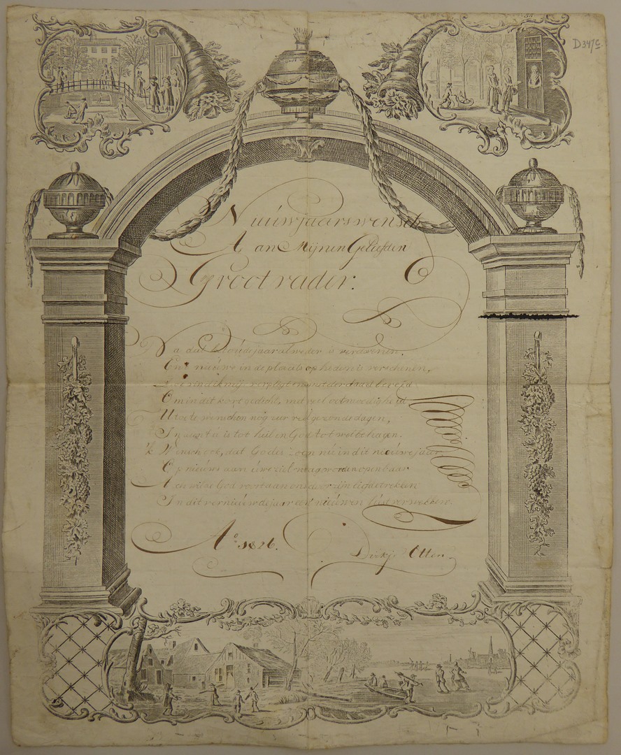 Gekalligrafeerde nieuwjaarswens van Dirkje Otten aan haar grootvader, in gedrukt cartouche