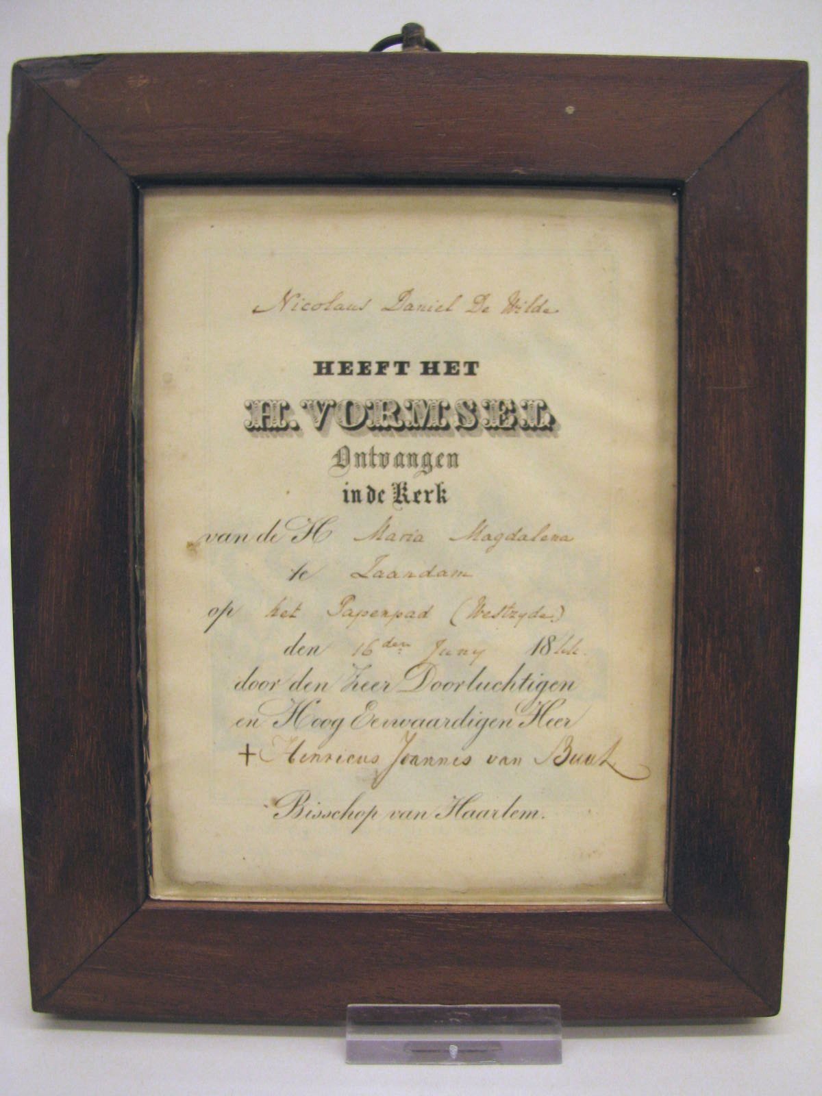 Vormselprent met pinkstervoorstelling, van N.D. de Wilde, gevormd te Zaandam door H.J. van Buul