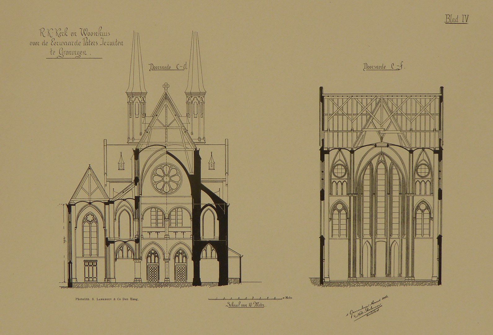 Groningen, R.K. kerk en woonhuis voor de eerwaarde paters jezuïeten, doorsneden
