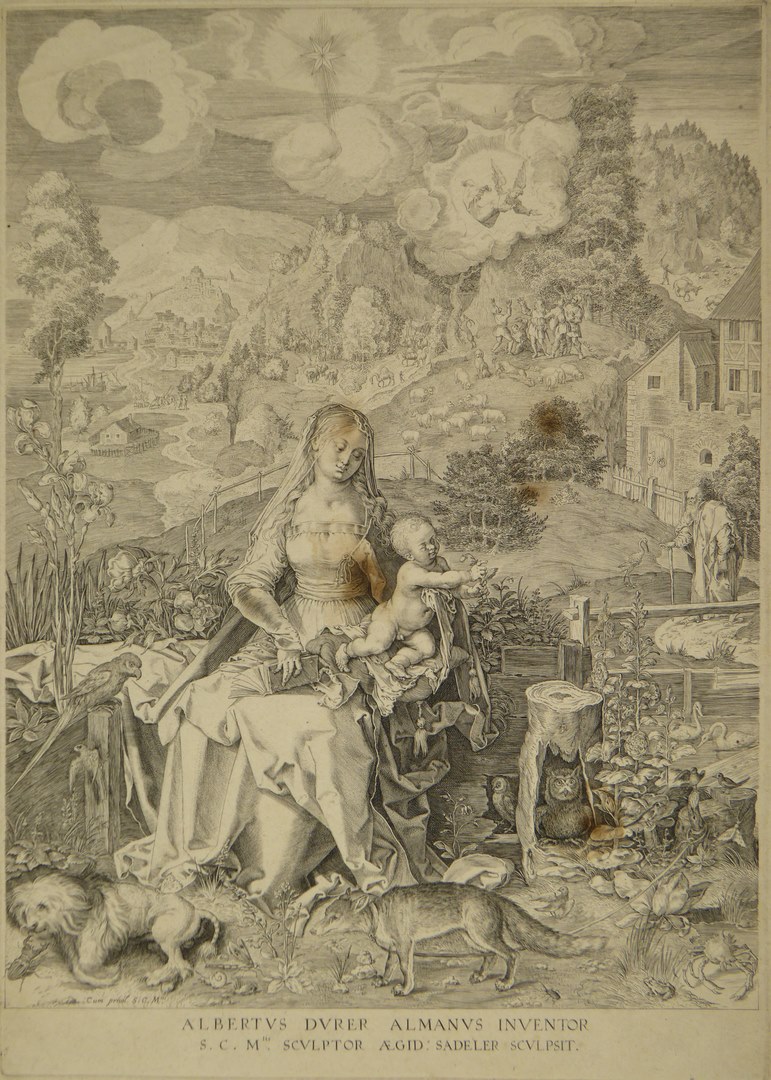 Maria met kind, gezeten temidden van bloemen en dieren, op de achtergrond de verkondiging aan de herders
