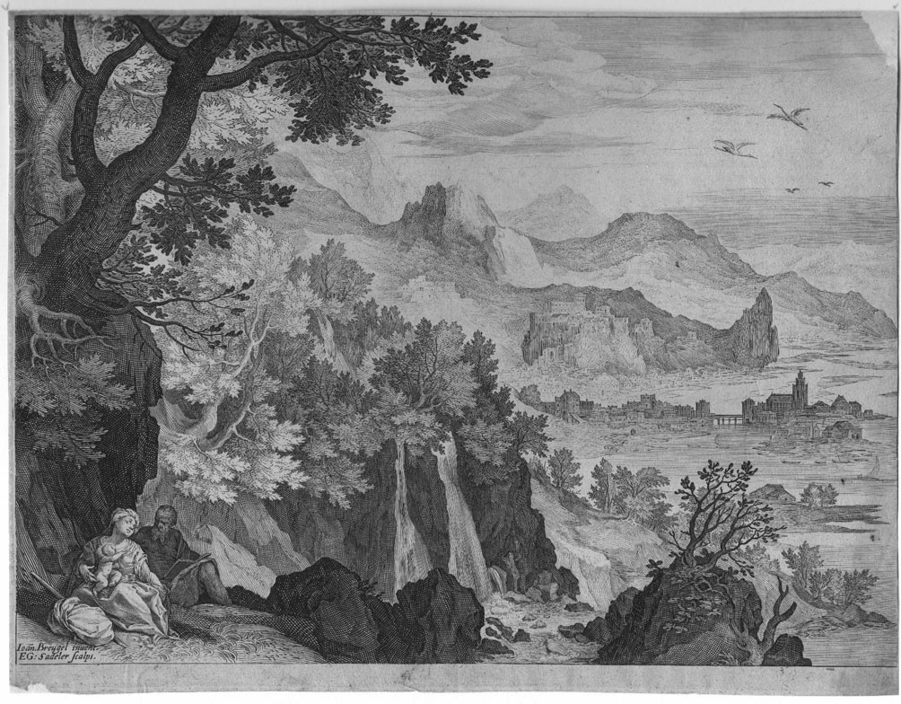 Rust op de vlucht naar Egypte: Type 'wereldlandschap'. In het uiterste linkerhoekje zit de Heilige Familie onder een rots waarop een loofboom staat. Maria heeft het Christuskind op schoot. Zij houdt Hem met haar rechterhand vast en heeft de blik schuin omhoog gericht. Het Kind strekt Zijn rechterarmpje naar haar uit. Links van Maria een ...