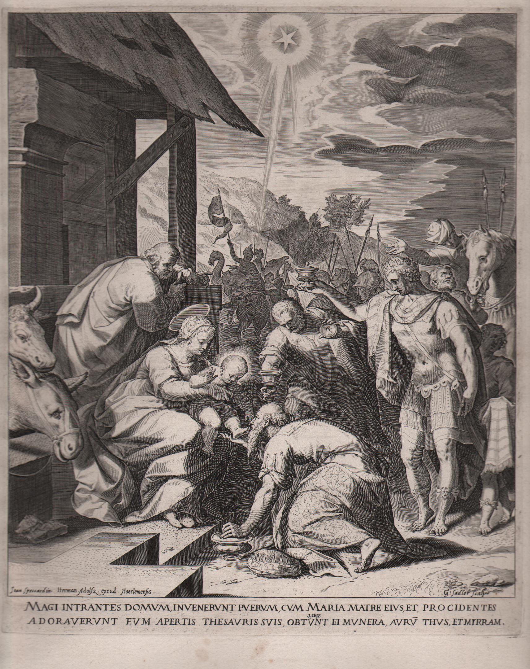 Aanbidding der koningen: Grote levendige prent. Aan de linkerkant zit Maria op een verhoging met het Christuskind op schoot. Zij heeft een nimbus om het hoofd en houdt, licht voorover gebogen, met beide handen haar Kind vast. De naakte Christus heeft een stralennimbus om het hoofd en kijkt naar de geknielde koning voor Hem. Rechts ...