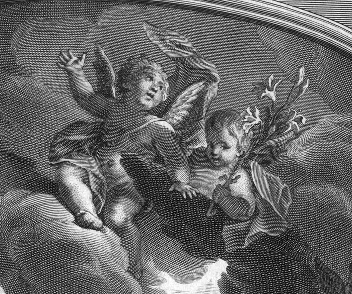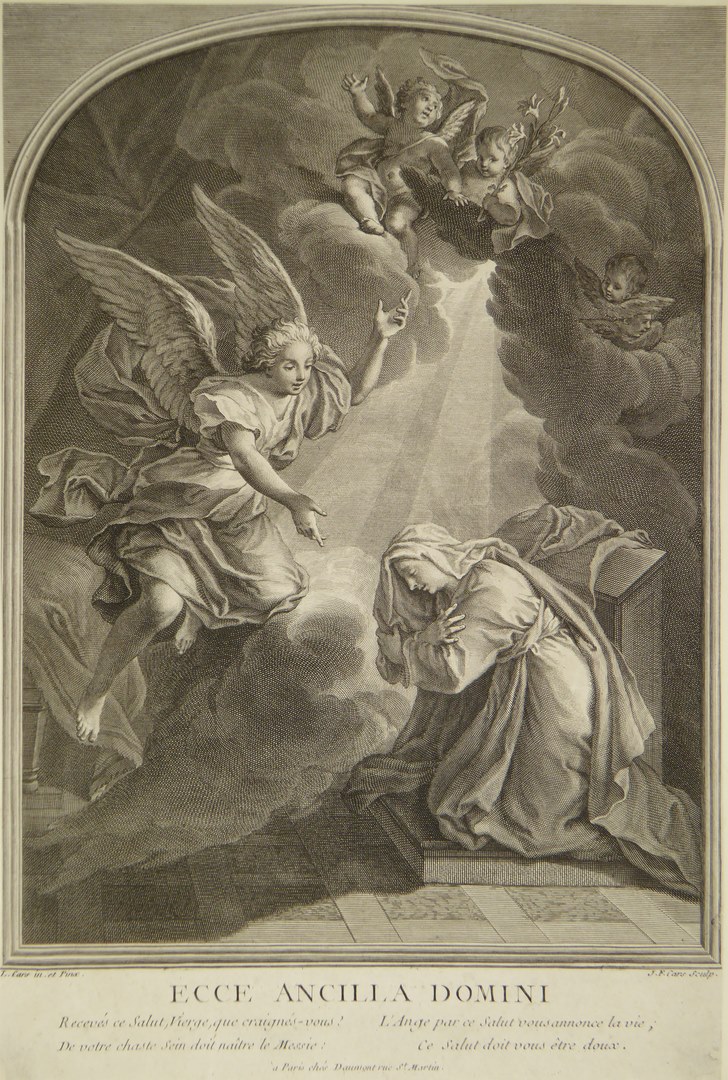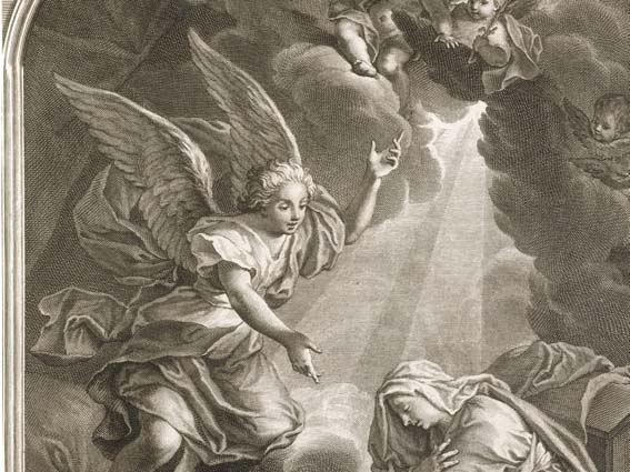 Annunciatie: Op de voorgrond aan de rechterkant ligt Maria geknield met de armen gekruist op de borst. Zij knielt op een knielbank en heeft zich omgedraaid naar Gabriel die binnen vliegt. Maria draagt een hoofddoek en heeft de ogen gesloten. Links boven Maria Gabriel die dicht boven de grond op een wolk vliegt. Met zijn ...