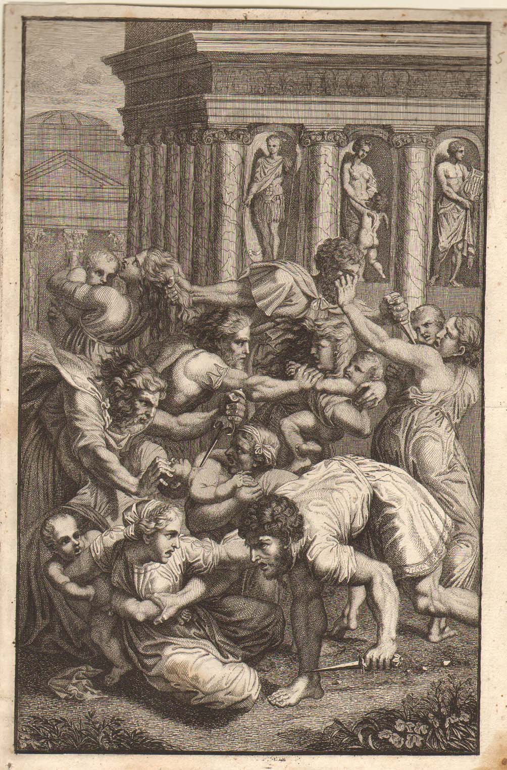 Kindermoord: dynamische prent met wervelende compositie van moeders die hun kinderen vasthouden en beschermen en soldaten die met dolken de kinderen willen doden. De gezichtsuitdukkingen van de moeders zijn panisch, van de soldaten vastberaden. Op de achtergrond staan twee klassieke tempels. De achterste tempel lijkt op het Pantheon in Rome van keizer Hadrianus (zuilen, timpaan, ...