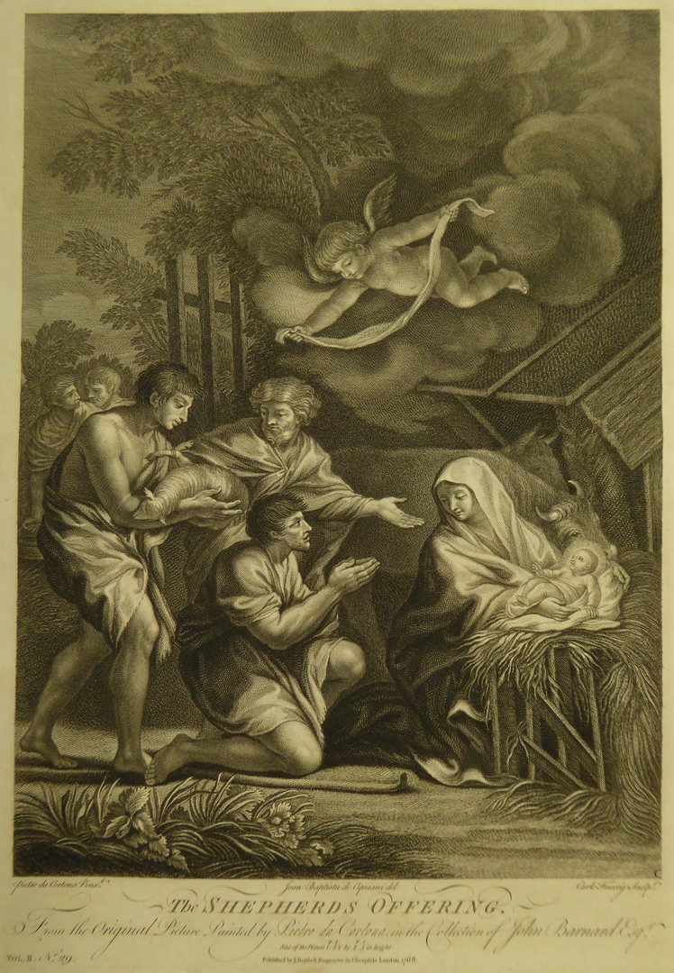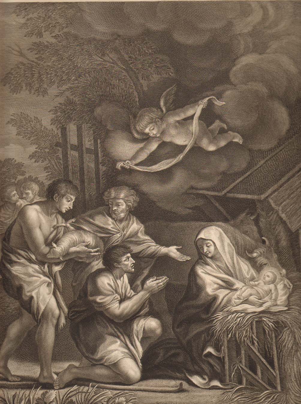 Aanbidding der herders: Aan de rechterkant van de prent ligt Maria geknield voor de kribbe die rechts van haar staat. Zij heeft haar mantel om het hoofd geslagen en kijkt over haar rechterschouder naar de herders. Zij omarmt met beide handen het Christuskind dat op een doek op een met hooi bedekte houten kribbe ligt. ...