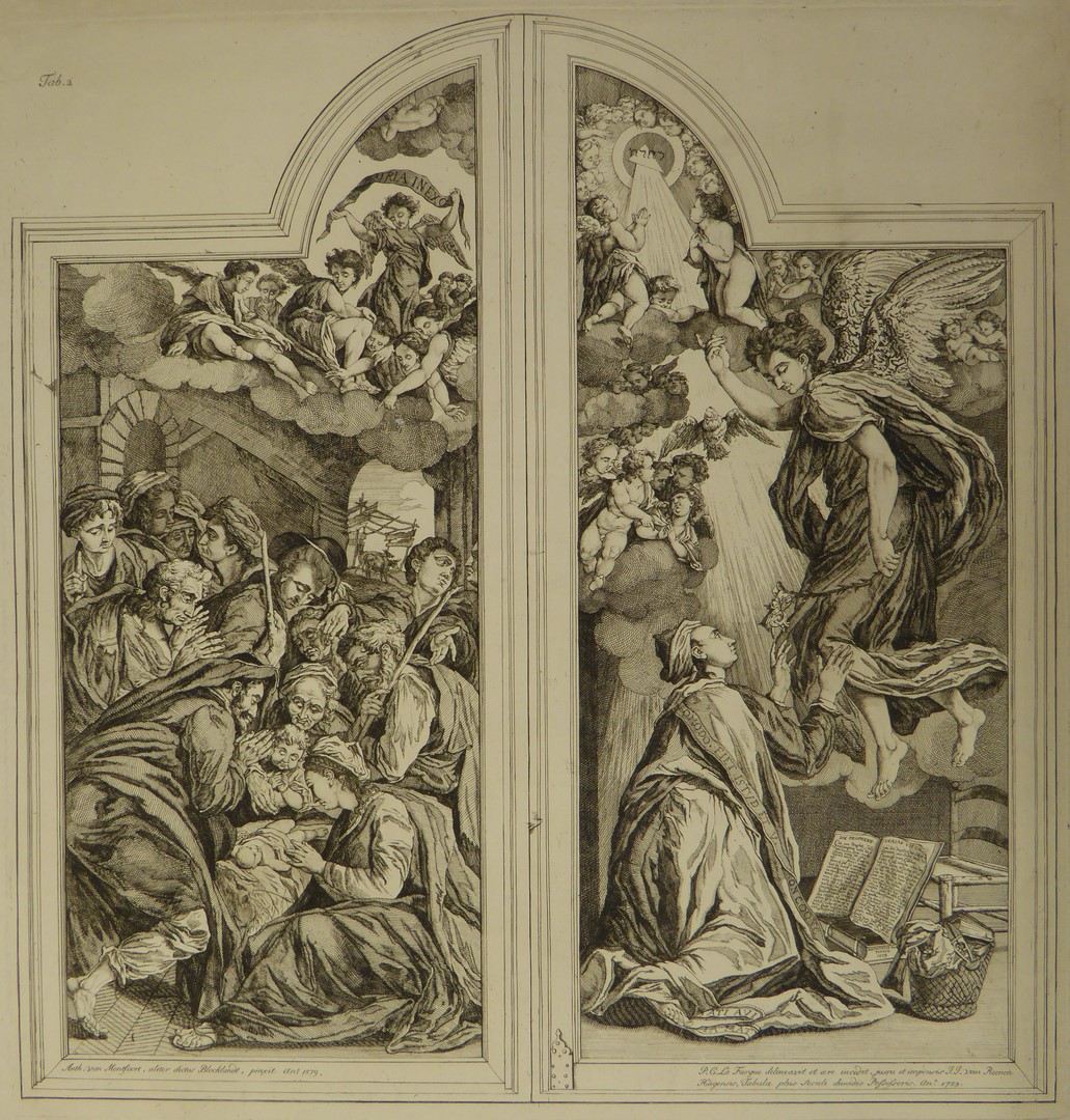 Zeer grote dynamische prent in de vorm van een vleugeldeur met Aanbidding der herders: Op de voorgrond zit Maria met gevouwen handen bij de kribbe. Mooie compositie met Jozef die zich ook over de kribbe buigt. Boven hen veel herders. Op de achtergrond enige architectuur met een vervallen hek met de os en ezel. Helemaal ...