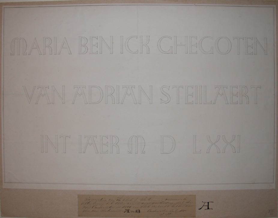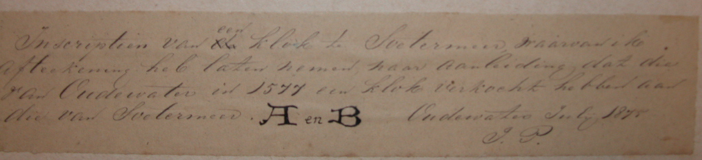 Zoetermeer, afdruk van een klok wellicht afkomstig uit Oudewater. Op het etiket onder de tekening staat de volgende tekst: "Inscriptiën van een klok te Soetermeer, waarvan ik afteekening heb laten nemen, naar aanleiding, dat die van Oudewater in 1577 een klok verkocht hebben aan die van Soetermeer. A en B. Oudewater julij 1875 J.P."