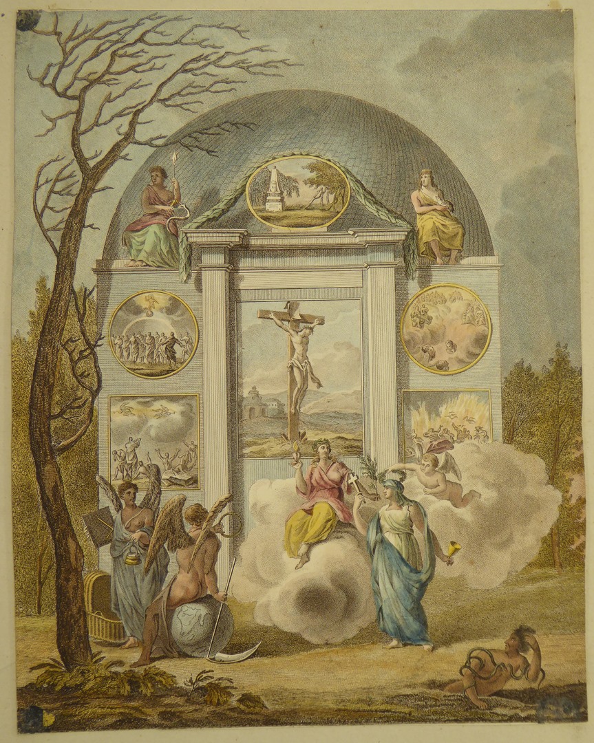 Allegorische voorstelling met o.m. Christus, Hemel, Hel, Geloof, Liefde enz., ingekleurd