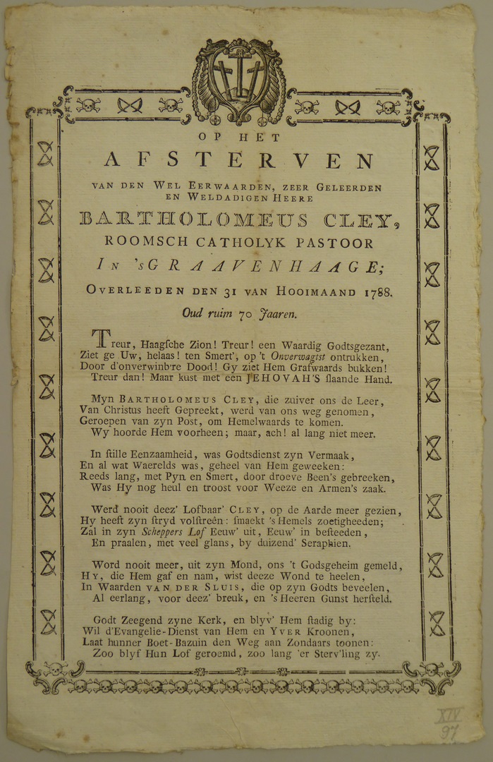Prent t.g.v. het overlijden van pastoor Bartholomeus Cley, 1788, met gedicht
