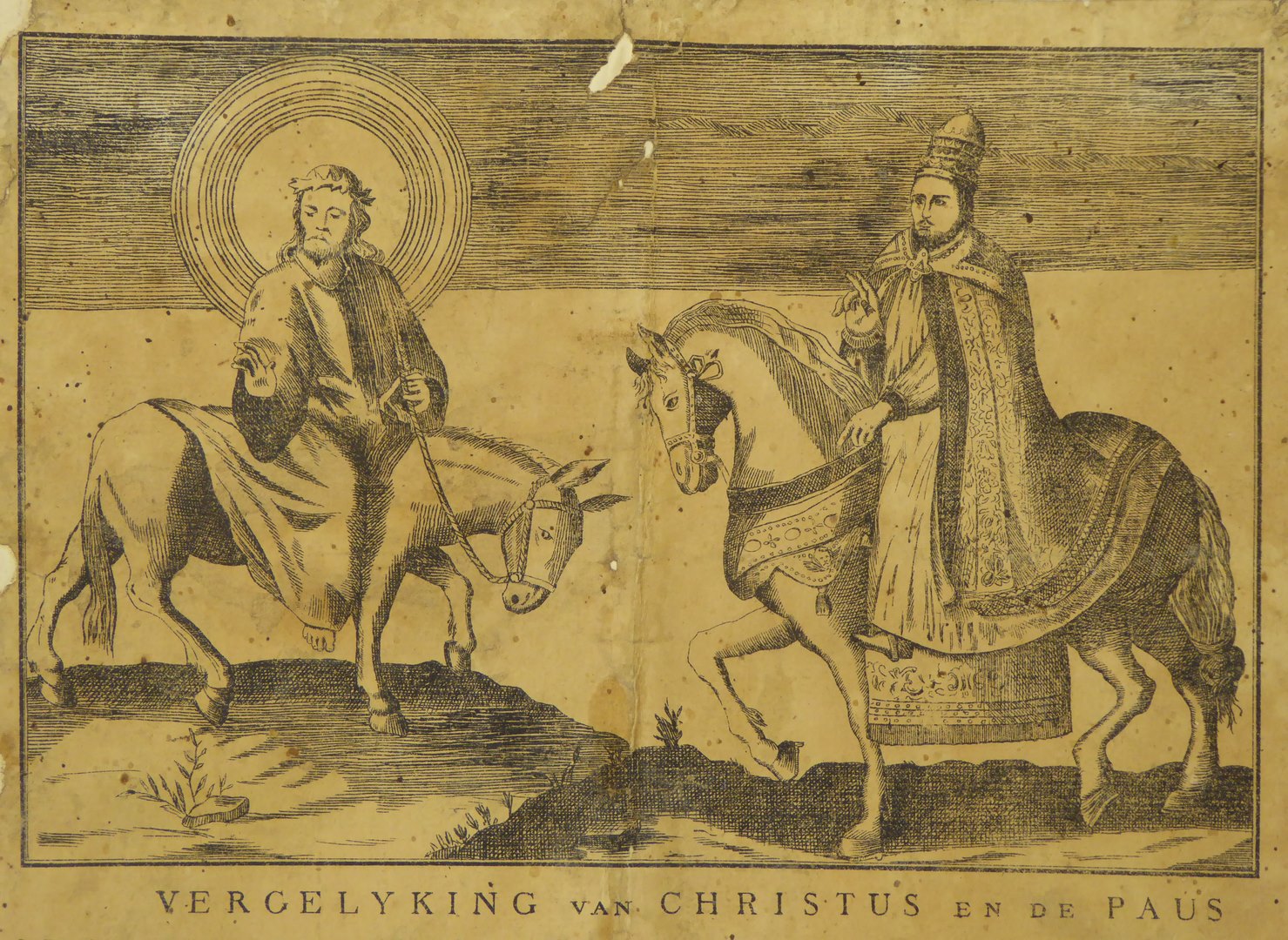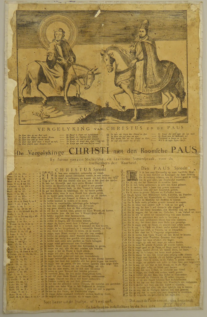 Spotprent op de paus met Christus op ezel en paus te paard