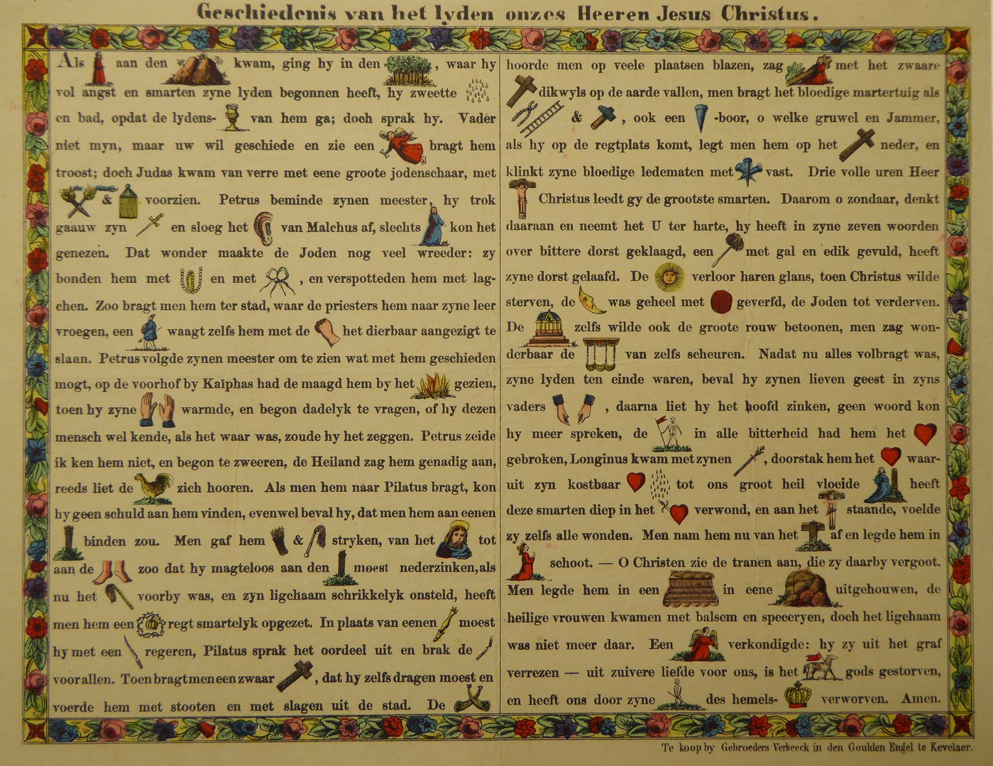 Passieverhaal, waarbij aantal zelfstandige naamwoorden zijn vervangen door afbeeldingen, ingekleurd