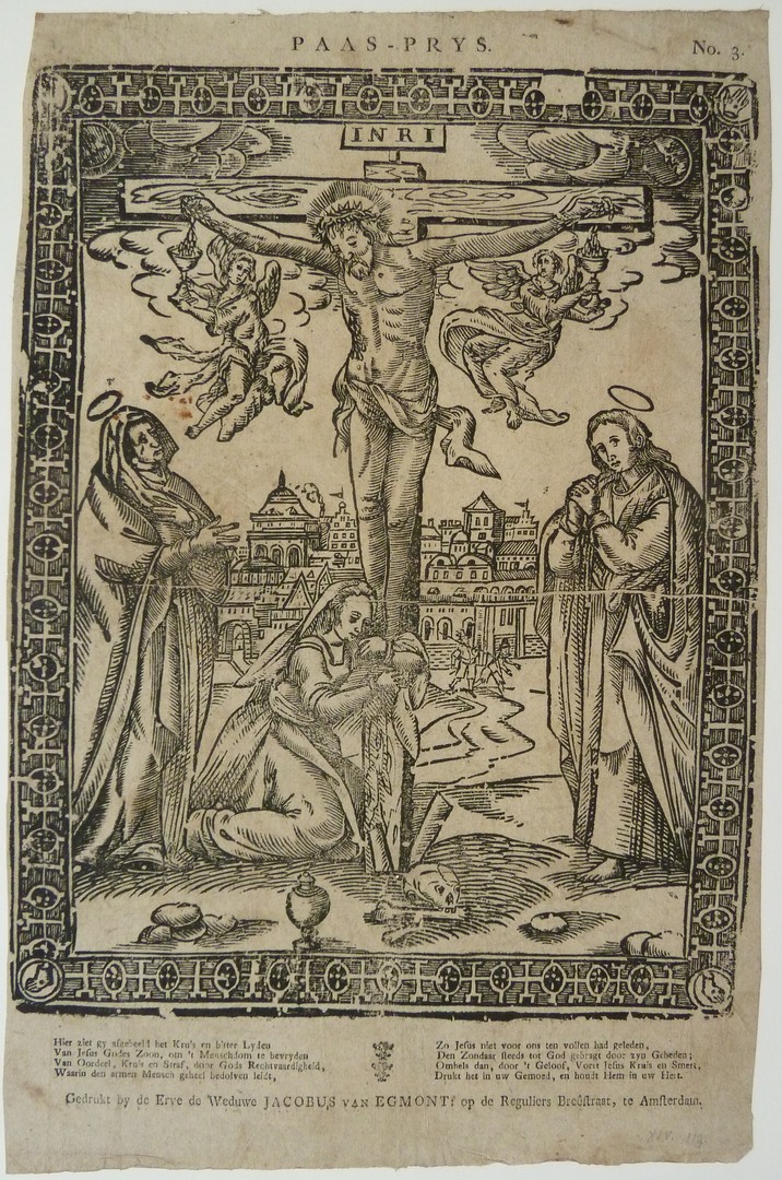 Volksprent, Paasprijs, gekruisigde Christus met Maria, Johannes en Maria Magdalena, met gedicht