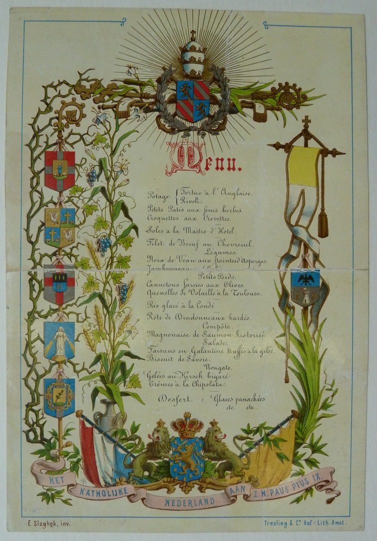 Menu diner juni 1877 gouden bisschopsfeest van Paus Pius IX, in het paleis van de Volksvlijt