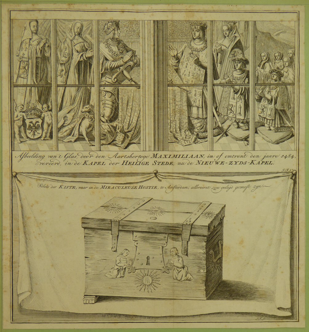 Dubbelprent Mirakel van Amsterdam: (boven) Afbeelding van 't glas door den aartshertog Maximiliaan, in of omtrent den jaare 1484, vereerd, ... Nieuwe-Zyds-Kapel, (onder) Schets der kiste, waar in de miraculeuse hostie, te Amsterdam, allereerst zou gelegd zijn