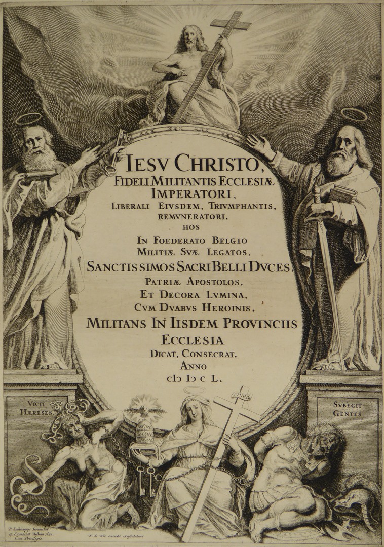 Centrale tekst omgeven door afbeeldingen van o.m. Christus, Petrus, Paulus, Kerk