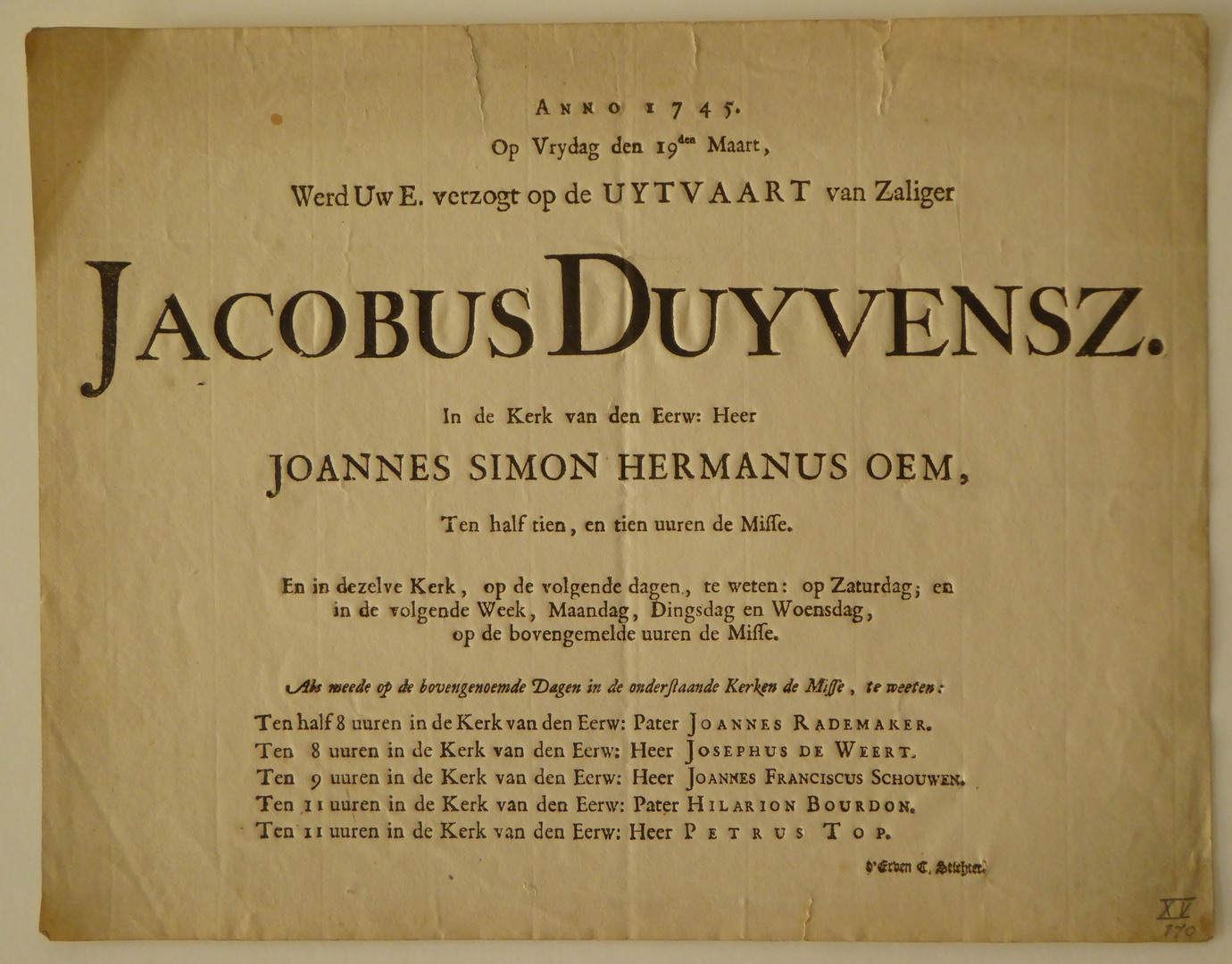 Verzoek tot bijwoning uitvaart Jacobus Duyvensz.