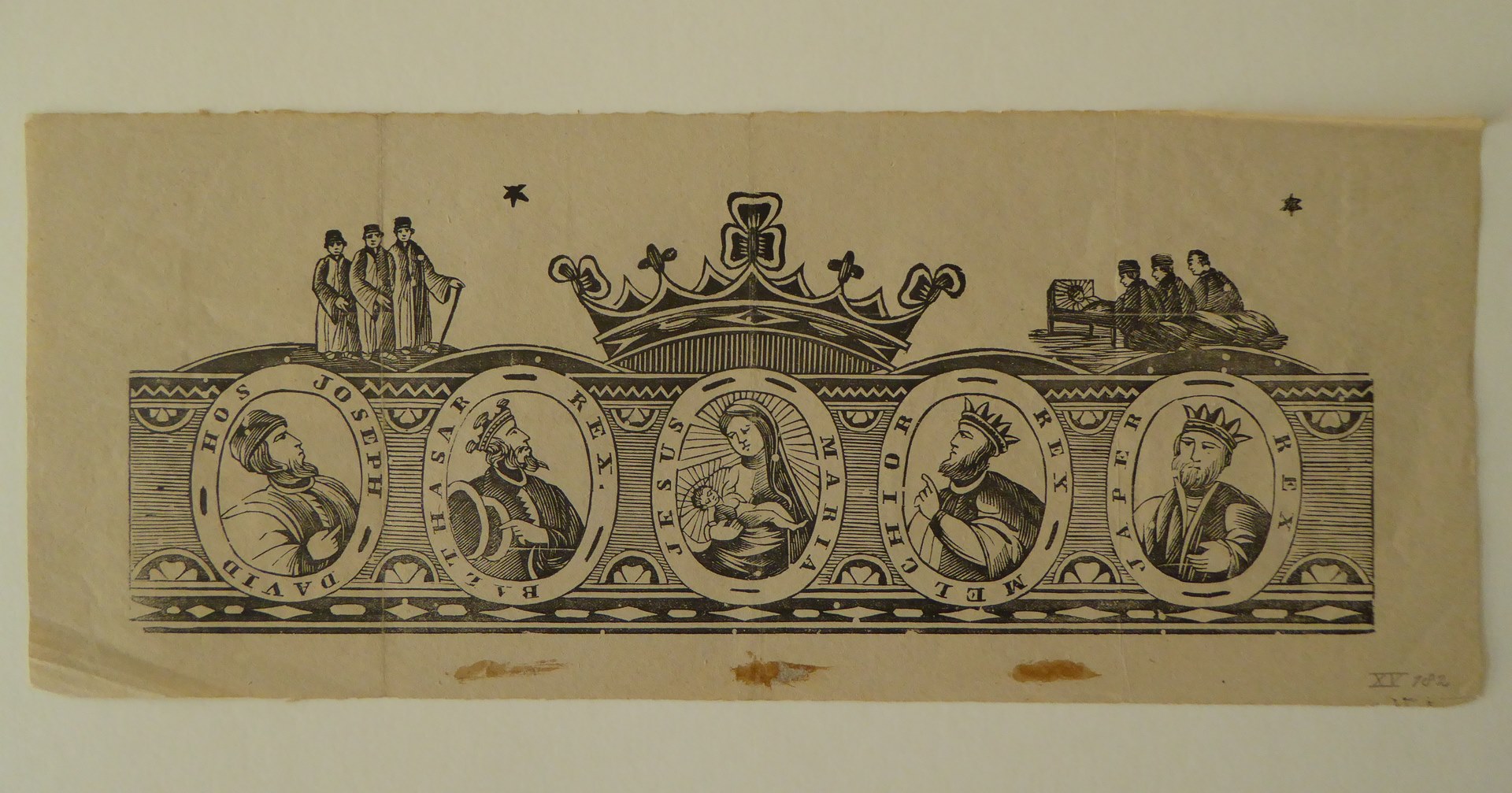 Driekoningenprent, vijf medaillons met portretten van Jozef, Maria met kind en de drie koningen, hoort bij BMH g828