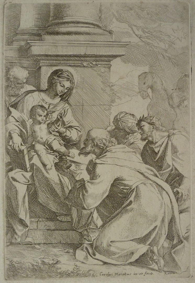 Annunciatie: Enigszins grof gearceerde dynamische prent. Aan de linkerkant zit Maria met het Christuskind op schoot. De verhoging waar zij op zit heeft twee treden waarop haar rechtervoet in sandaal is te zien. Zij houdt Christus' armpje met haar linkerhand vast. Met haar rechterhand houdt zij een groot boek vast. Zij buigt haar hoofd waaromheen ...