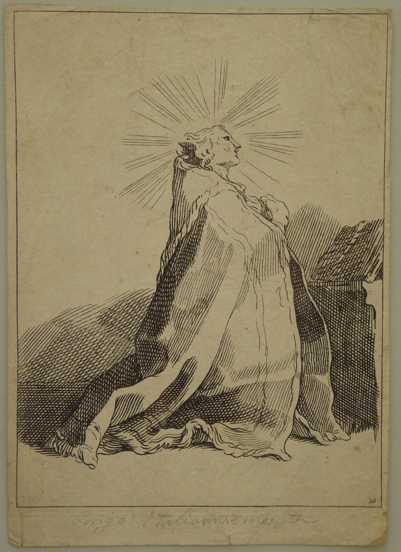 Geknielde man in de koorkap voor een lezenaar, waarop een boek