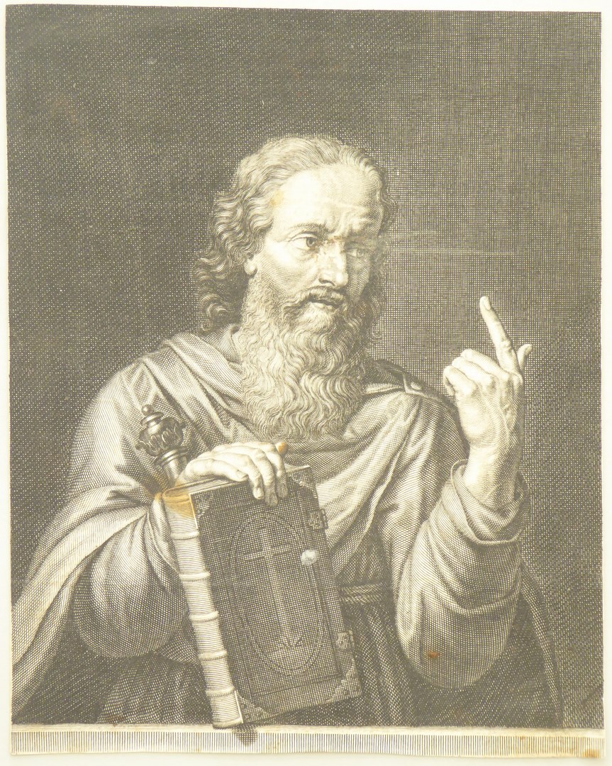 Apostel of evangelist, in de rechterhand boek, linkerwijsvinger heft hij omhoog