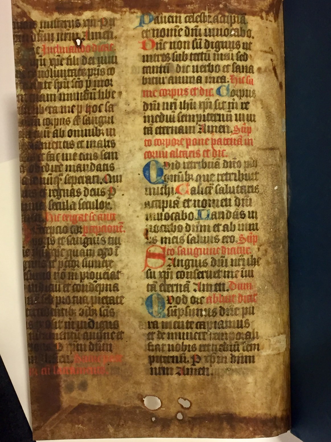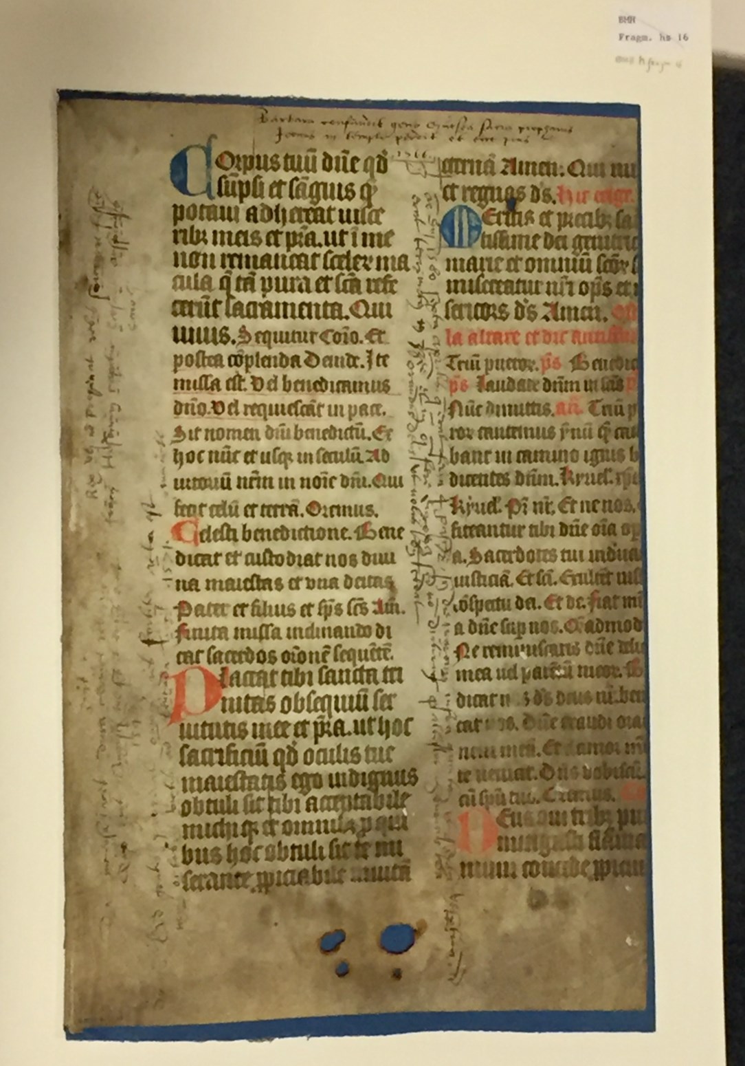 Een fragment van een missale uit de 15de eeuw (vermoedelijk vervaardigd in de Nederlanden). Glossen zijn van latere datum (16de eeuw).