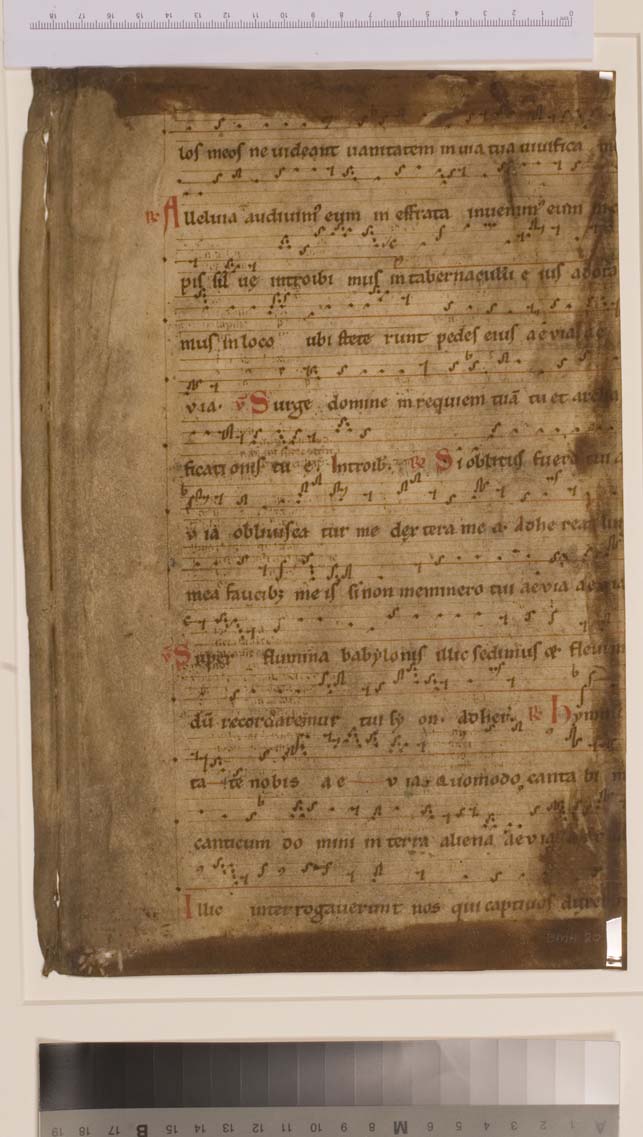 Het fragment bevat verzen en tegenverzen (responsen = antwoorden), die in deze periode gezongen zijn. De gezangen beginnend midden op de voorzijde van dit blad met de woorden Si oblitis fuero tui tot multitudo (midden verso) zijn de respons na de eerste lezing op de vierde zondag na Pasen (bij de Metten) tot het vers ...