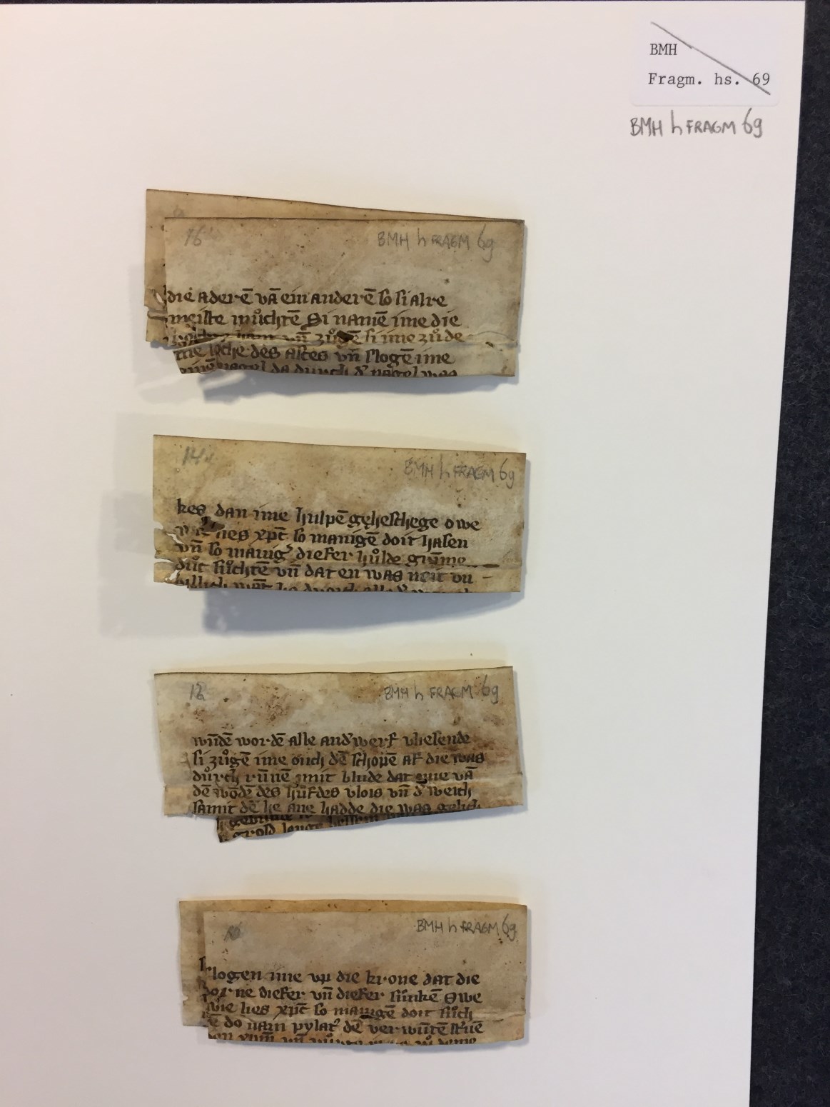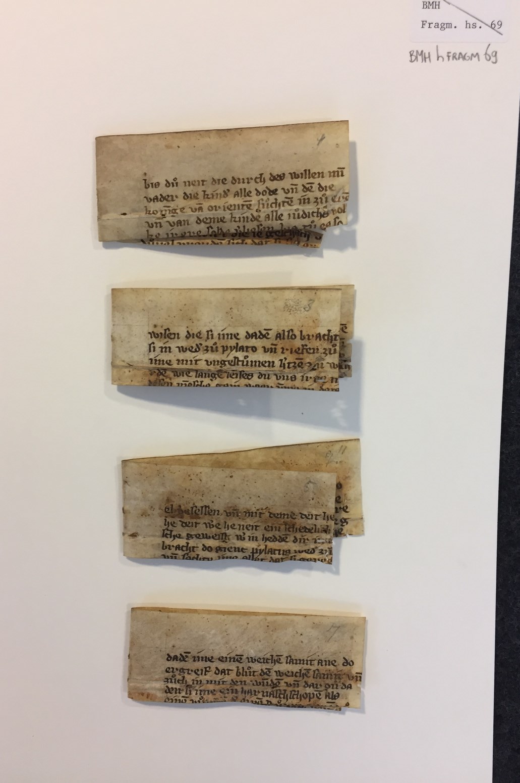 Fragmenten, vier stuks, bovenranden van folia uit één katern met teksten uit het leven van Jezus